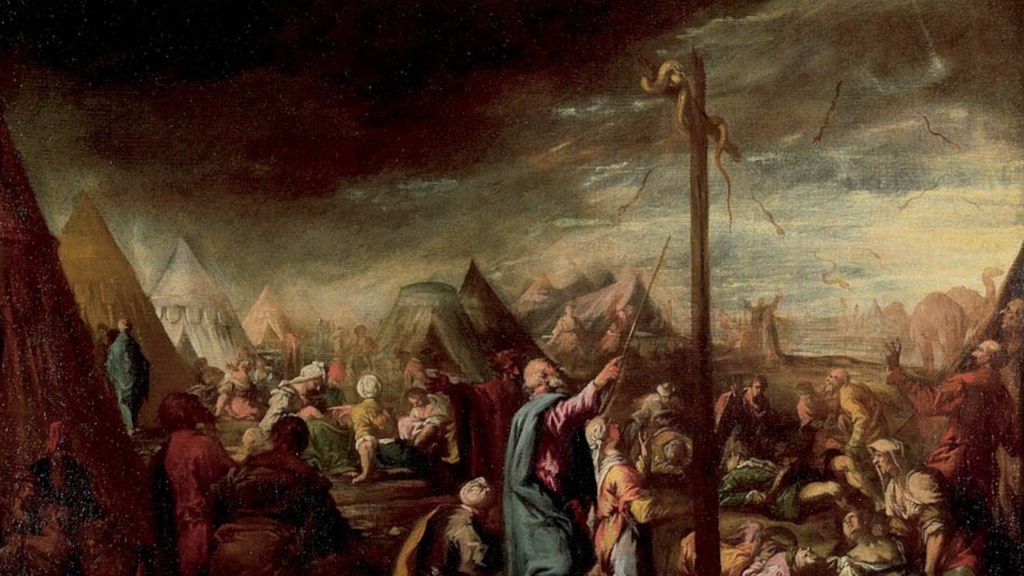 To explain this, Jesus takes Nicodemus back to a story he would know well from the Torah. When the Israelites were grumbling against God and Moses in the wilderness between slavery in Egypt and the Promised Land, the LORD sent poisonous snakes among the people because of their sin, and many were bitten and died (Numbers 21:4–9).